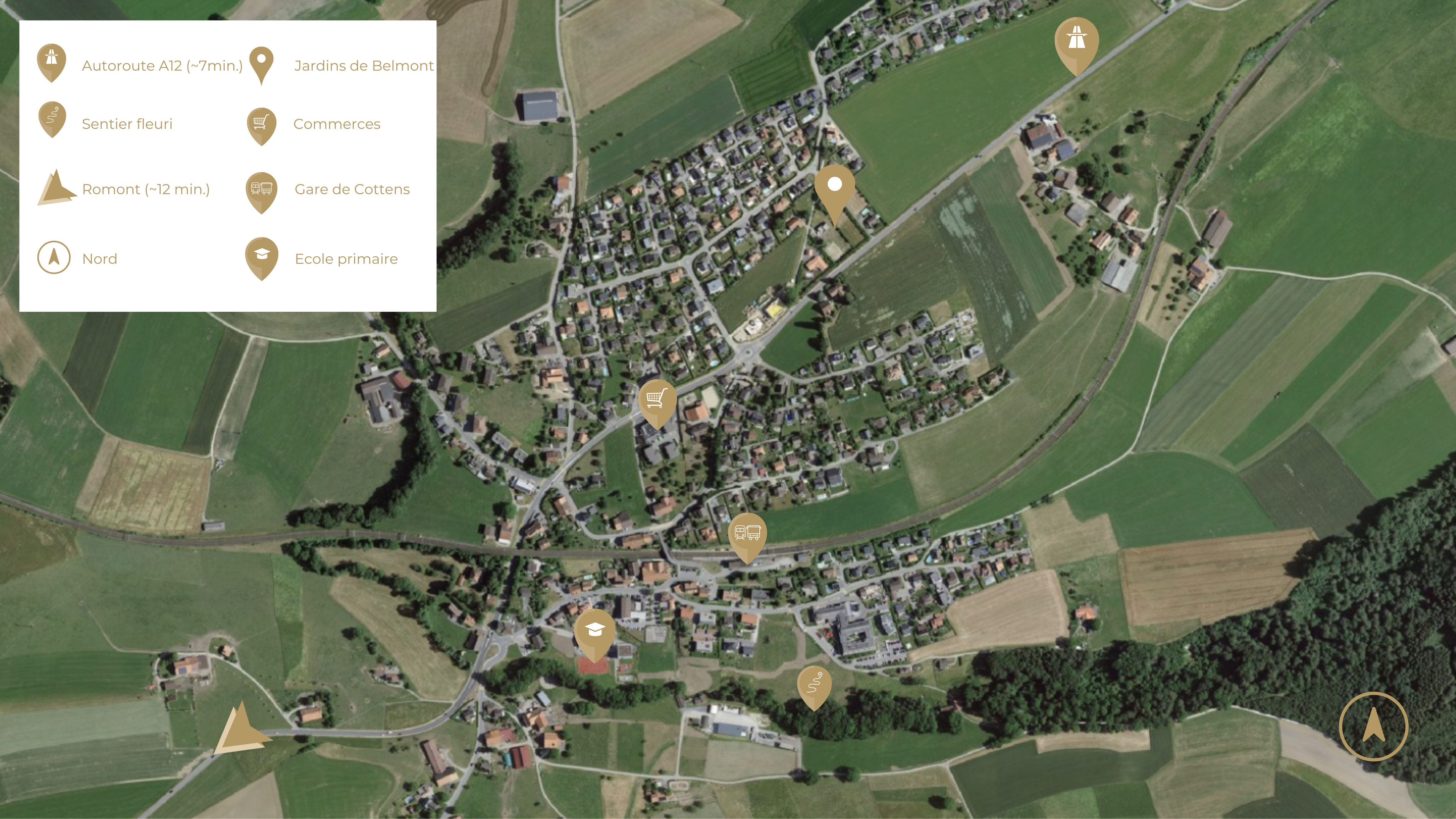 Située dans le district de la Sarine, la commune de Cottens séduit par son équilibre entre cadre de vie villageois, environnement verdoyant et proximité directe de Fribourg. La commune est idéalement desservie par les axes routiers et les transports publics, l'entrée d'autoroute A12 est située à Matran, à quelques minutes du bien.